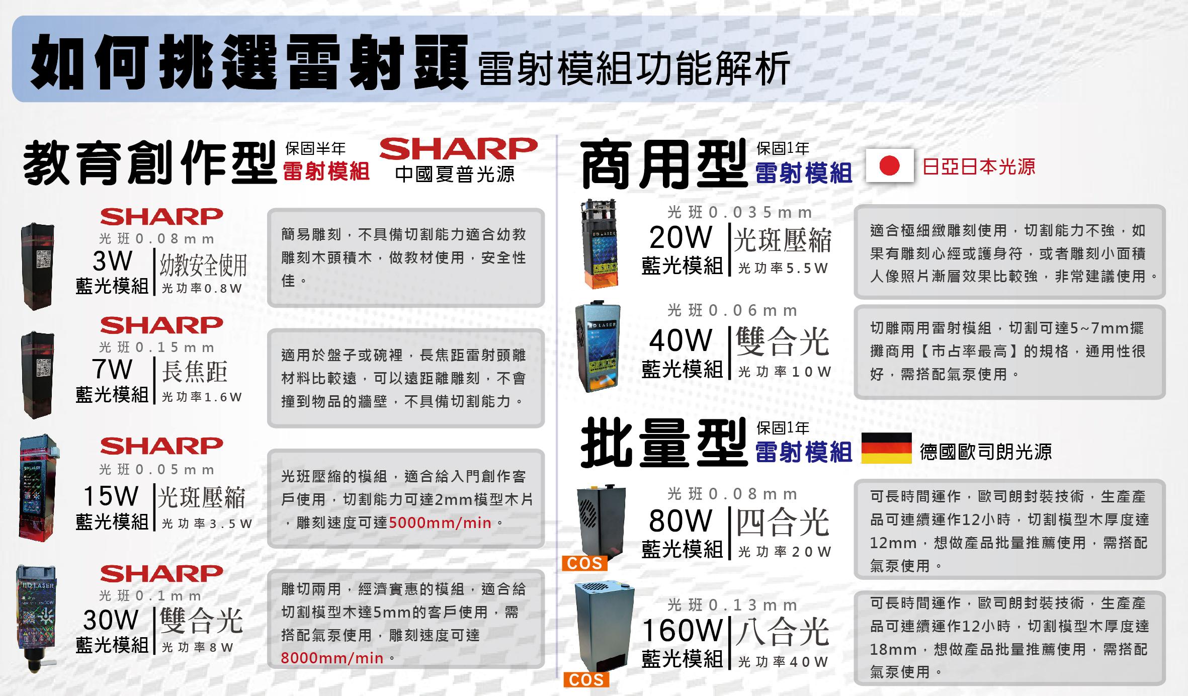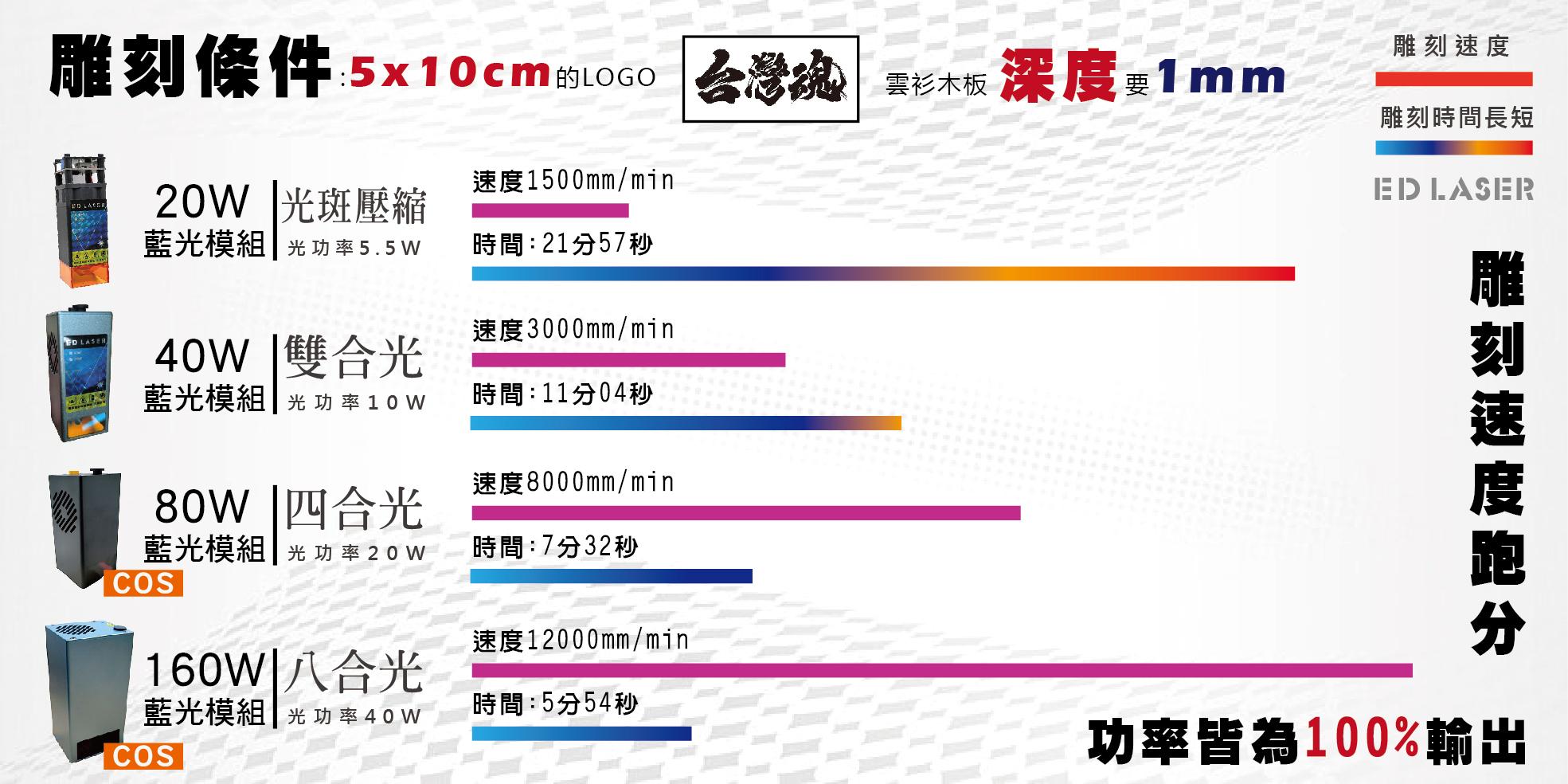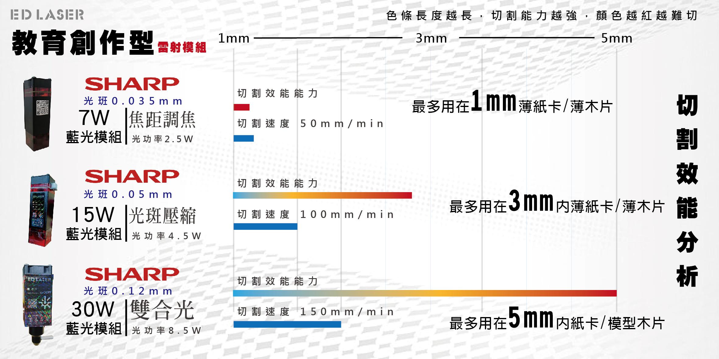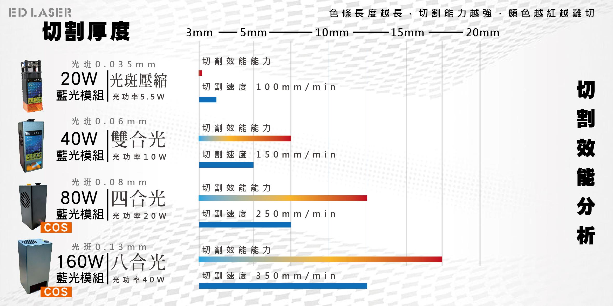 目前非工業機型,台灣只有EDLASER的大功率藍光,使用高成本德國COS封裝技術雷射模組,不易產生高溫,不易衰退,廣為台灣量產的公司所使用。